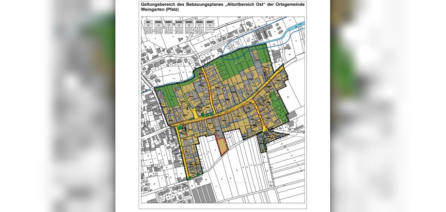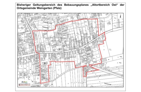 Der Geltungsbereich umfasst vollständig die 229, 230, 231, 231/2, 231/3, 232/1, 232/2, 232/3, 233/2, 233/3, 233/4, 233/5, 234, 235, 236, 236/2, 240/1, 240/2, 242/1, 242/2, 245, 248/1, 249/3, 249/4, 249/6, 249/8, 251, 252, 253, 255, 256, 257, 258, 263, 264, 265, 268, 270, 271, 271/2, 272, 274, 276, 279/2, 280/1, 287/2, 287, 287/1, 289, 290, 290/2, 291/1, 293, 295/1, 295/2, 295/3, 296/1, 296/2, 300, 300/4, 301, 302, 306, 366/3 (Straße „Neugasse“), 366/19 (Straße „Germersheimer Straße L507“), 403/2, 403/3, 404, 405, 406/2, 430/4, 430/5, 430/6, 430/10, 432/1 (Straße „Zeiskammer Zeil“), 485/2, 485/3, 485/4, 486/3, 487, 537/11, 537/17, 537/23, 537/24, 5309, 5310, 5311, 5312, 5313, 5314, 5315/1, 5316/1, 5317, 5318, 5319, 5320, 5321, 5322, 5323, 5324, 5325, 5326 (Straße „Hauptstraße“), 5327 (Straße „Spitalstraße“), 5328 (Straße „Hauptstraße“), 5329, 5330, 5331/1, 5332, 5333, 5334, 5335, 5336, 5338, 5339 (Straße „Bahnhofstraße“), 5369, 5370, 5371, 5372, 5373, 5374, 5375, 5376, 5377, 5378, 5379, 5380, 5381, 5382, 5383, 5384, 5385, 5386, 5387, 5388, 5389, 5390, 5391, 5392, 5993, 5394, 5395, 5396, 5397, 5402 (Straße „Hauptstraße“), 5405 (Straße „Hauptstraße“), 5406 (Straße „Hauptstraße“), 5407 (Straße „Hauptstraße“), 5408 (Straße „Hauptstraße“), 5409 (Straße „Hauptstraße“), sowie Teilfläche der Flurstücksnummern 273, 275, 277, 277/2, 279, 279/1, 537/22, 5403 (Straße „Hauptstraße L507“) der Gemarkung Weingarten (Pfalz).